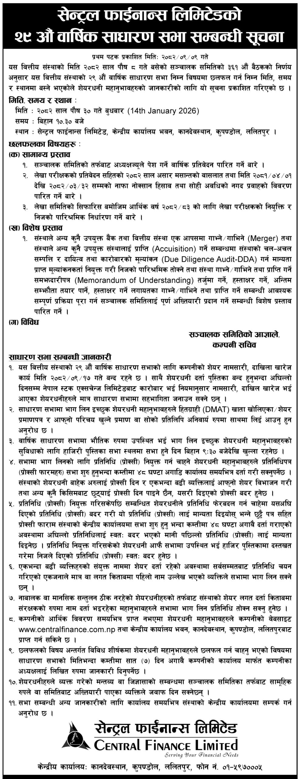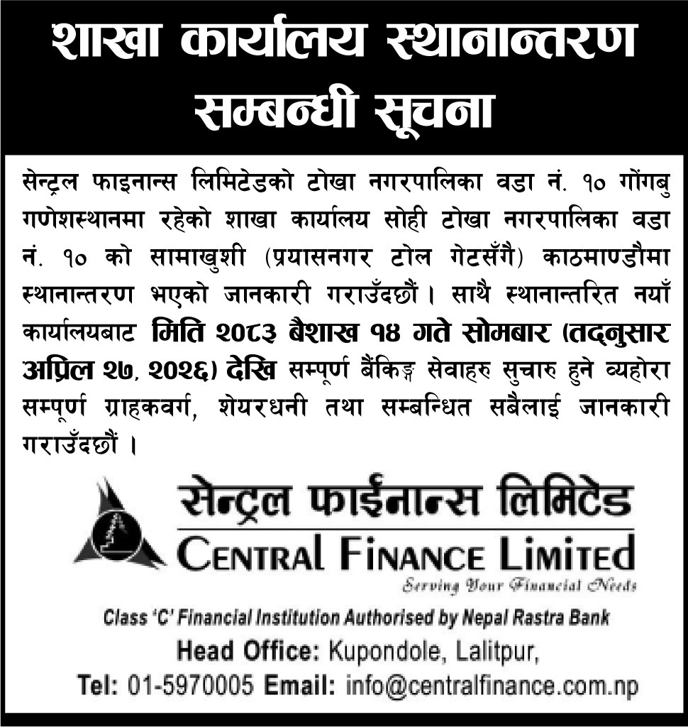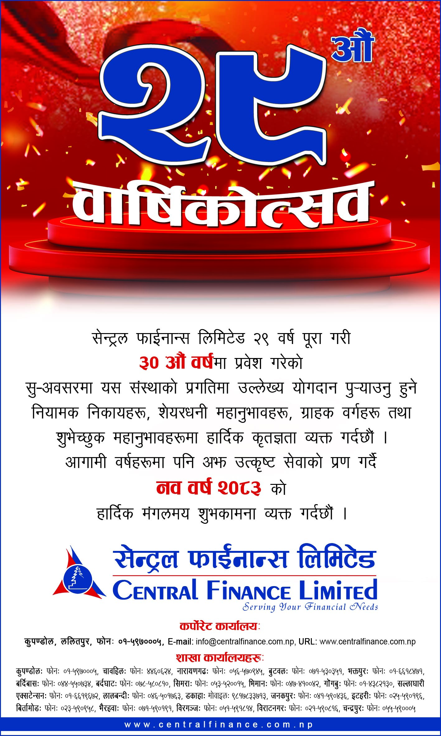 Central Finance Limited (CFL), was incorporated as a public limited company, on April 14, 1996. It has been established as per the Finance Company Act 2042 B.S. and Company Act 2053. It commenced operations on April 14, 1997, upon obtaining the operating license from Nepal Rastra Bank. Central Finance Limited envisions becoming a strong and reputed institution in the financial sector of Nepal by providing preferred products and services and ensuring attractive and substantial returns for shareholders with the help of well-experienced staff.
